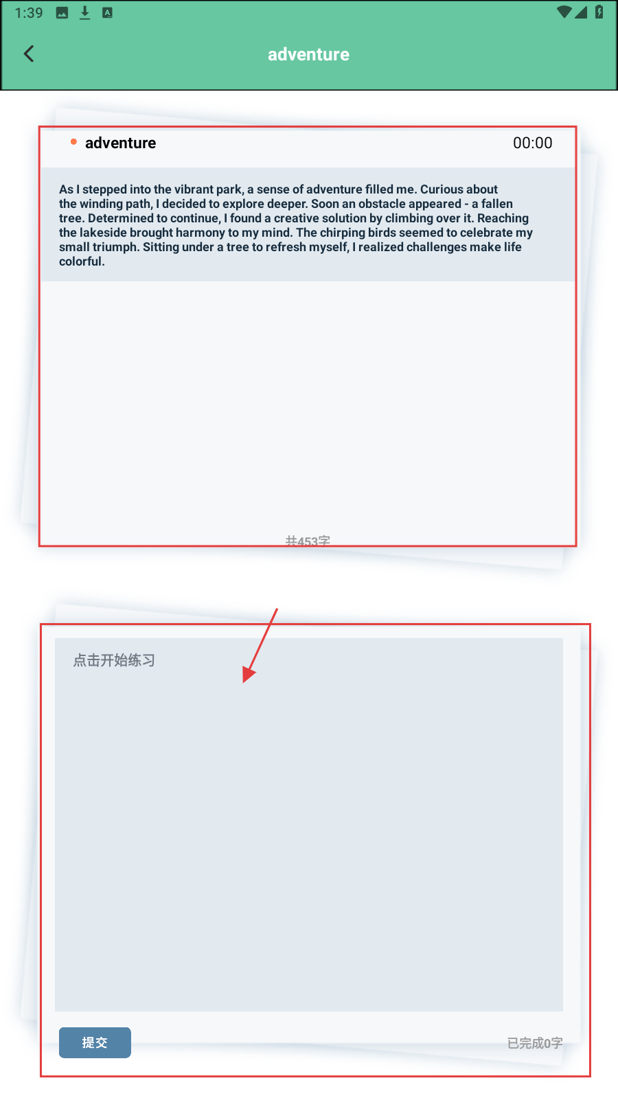 3、到“adventure”练习页,阅读文本后点【点击开始练习】,完成内容练习并提交。