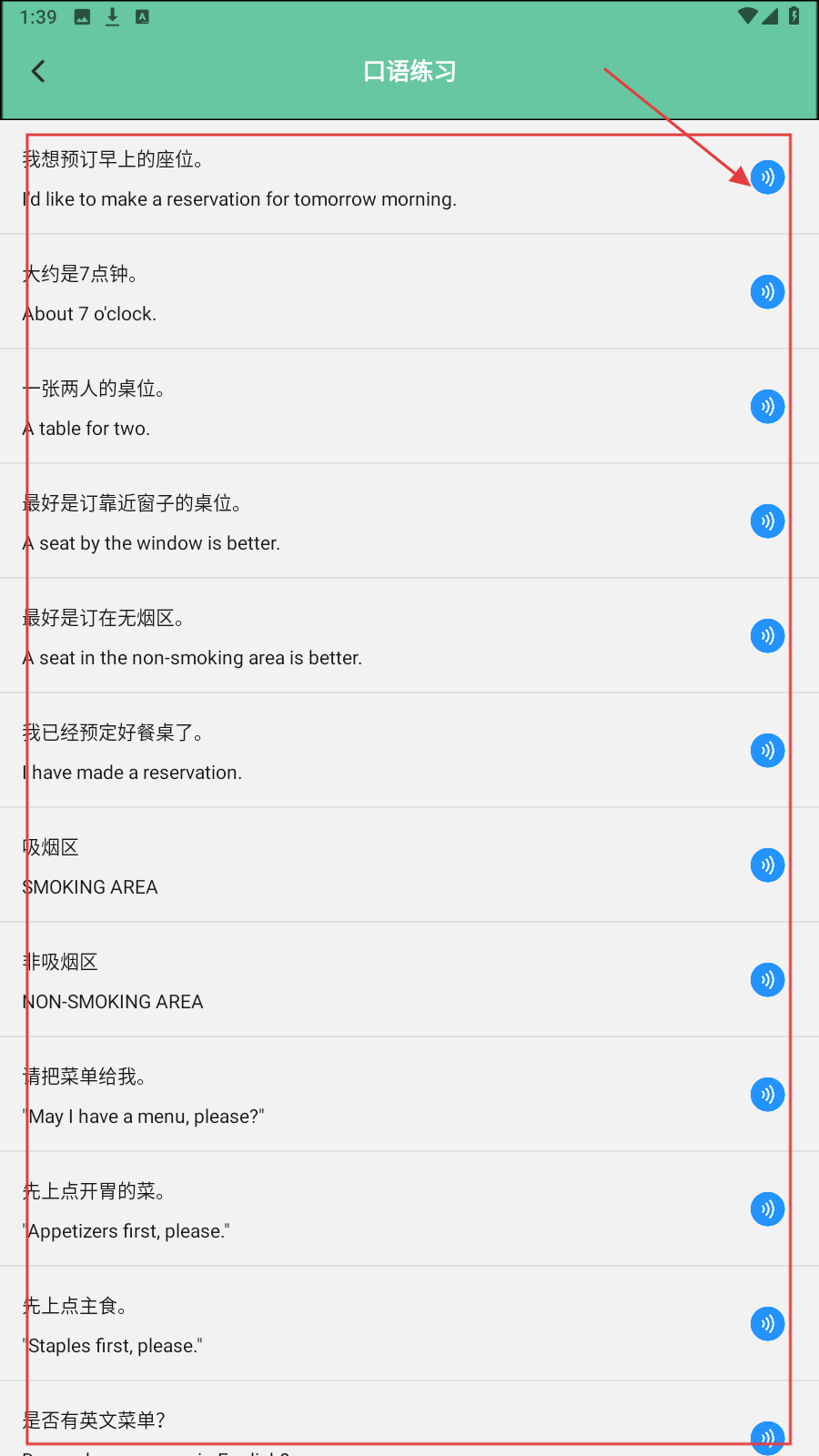 4、进入【口语练习】,点语音图标听例句发音,模仿练习预订、就餐等场景口语。