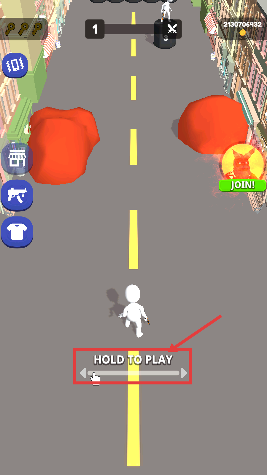 1、长按【HOLD-TO-PLAY】按钮,操控角色起跑,准备应对前方障碍与敌人。