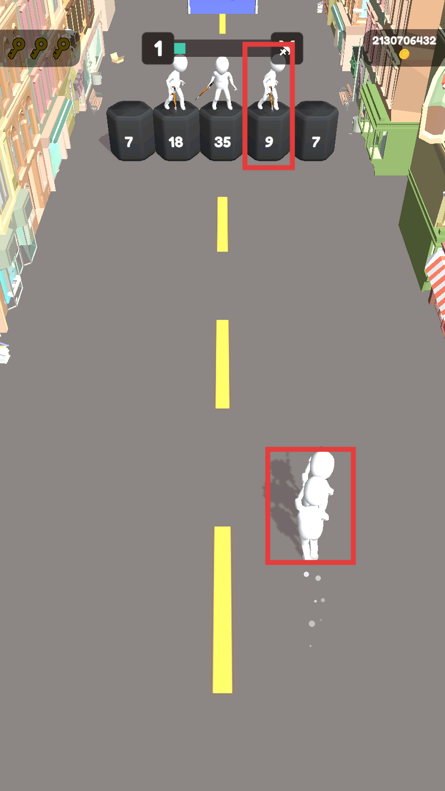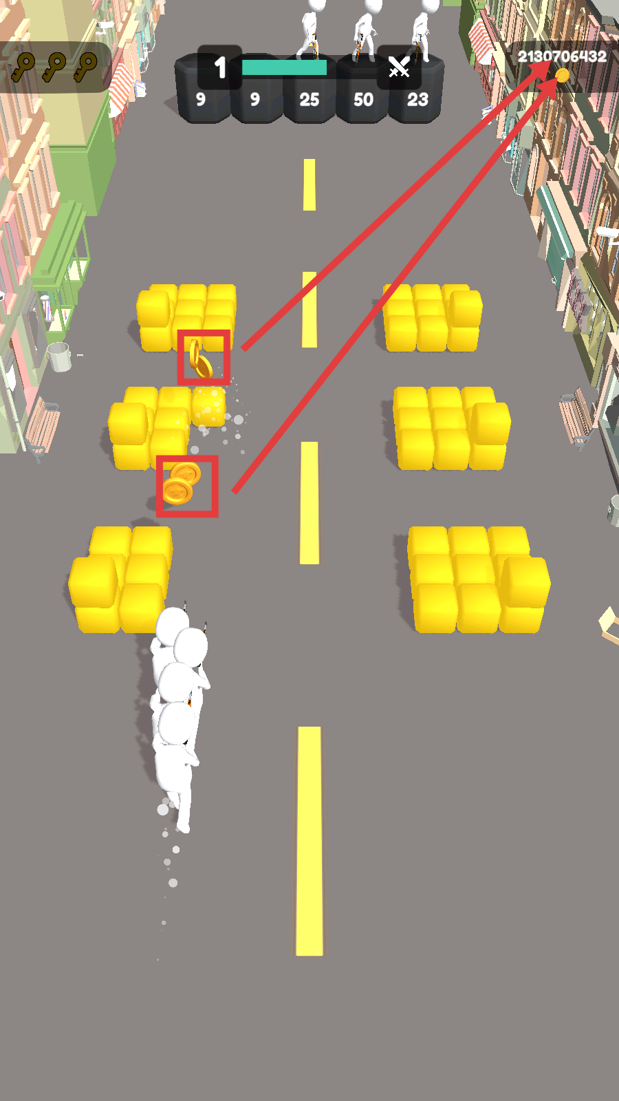 3、奔跑时拾取路径【金币】,利用掩体迂回,向敌方阵地推进,积累资源增强实力。