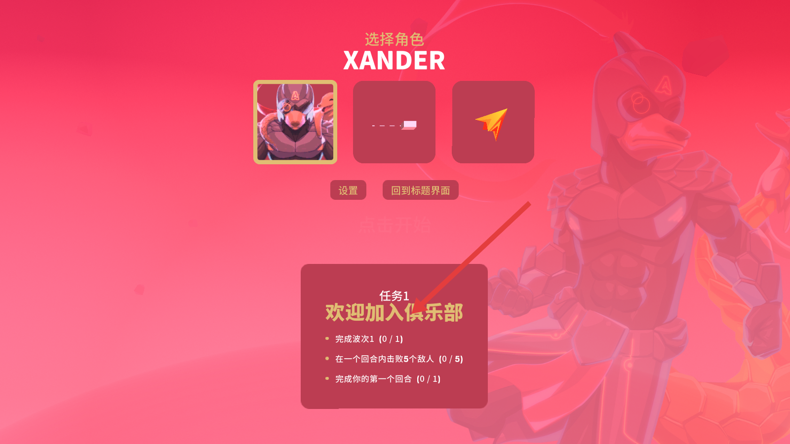 1、选择【XANDER】角色,查看【任务1-欢迎加入俱乐部】目标,明确波次、杀敌、回合任务方向。