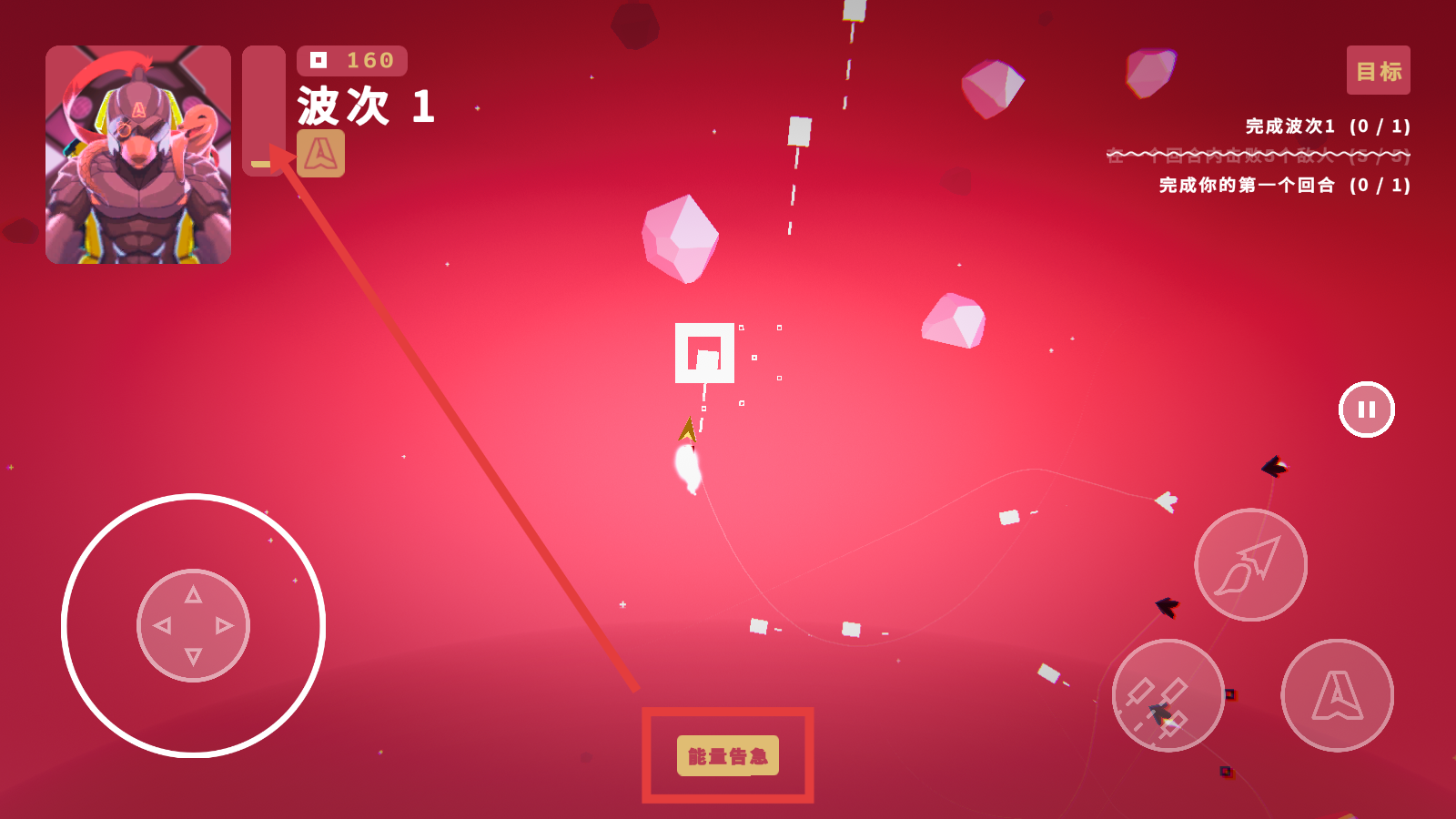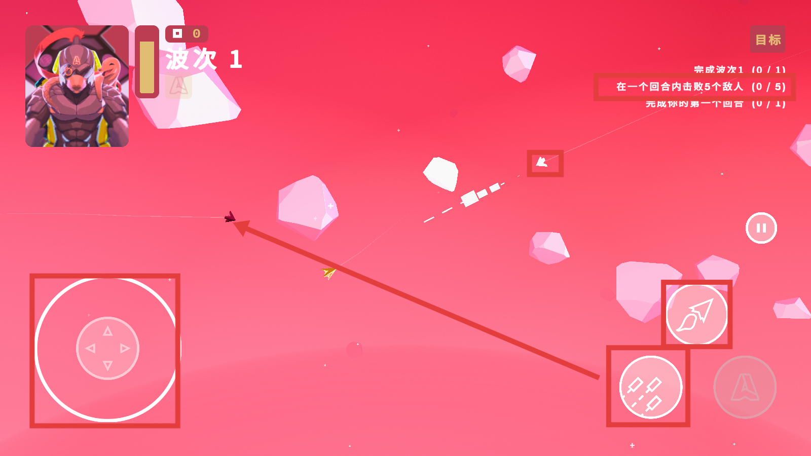 2、进入【波次1】,用左侧摇杆操控移动,右侧技能键攻击,瞄准敌人推进,冲击回合杀敌目标。