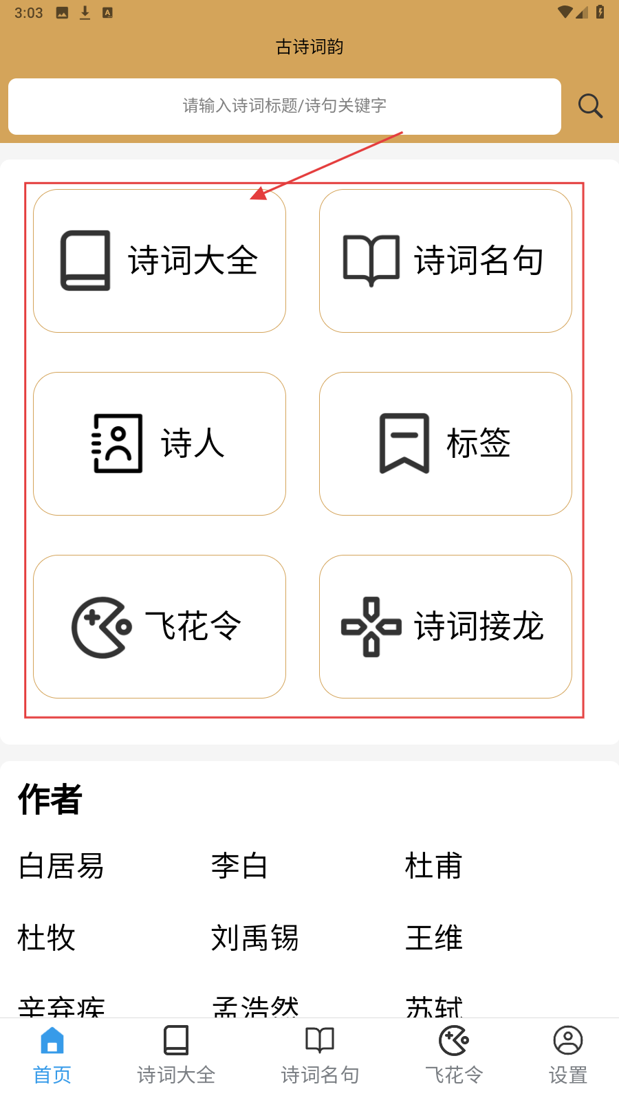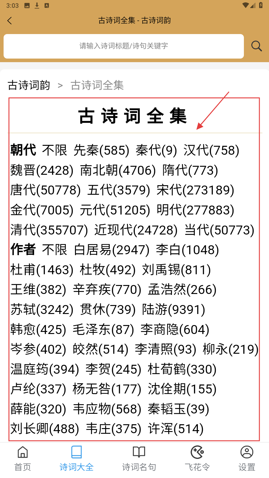 1、打开【古诗词韵】,选【诗词大全】,进入分类筛选页。