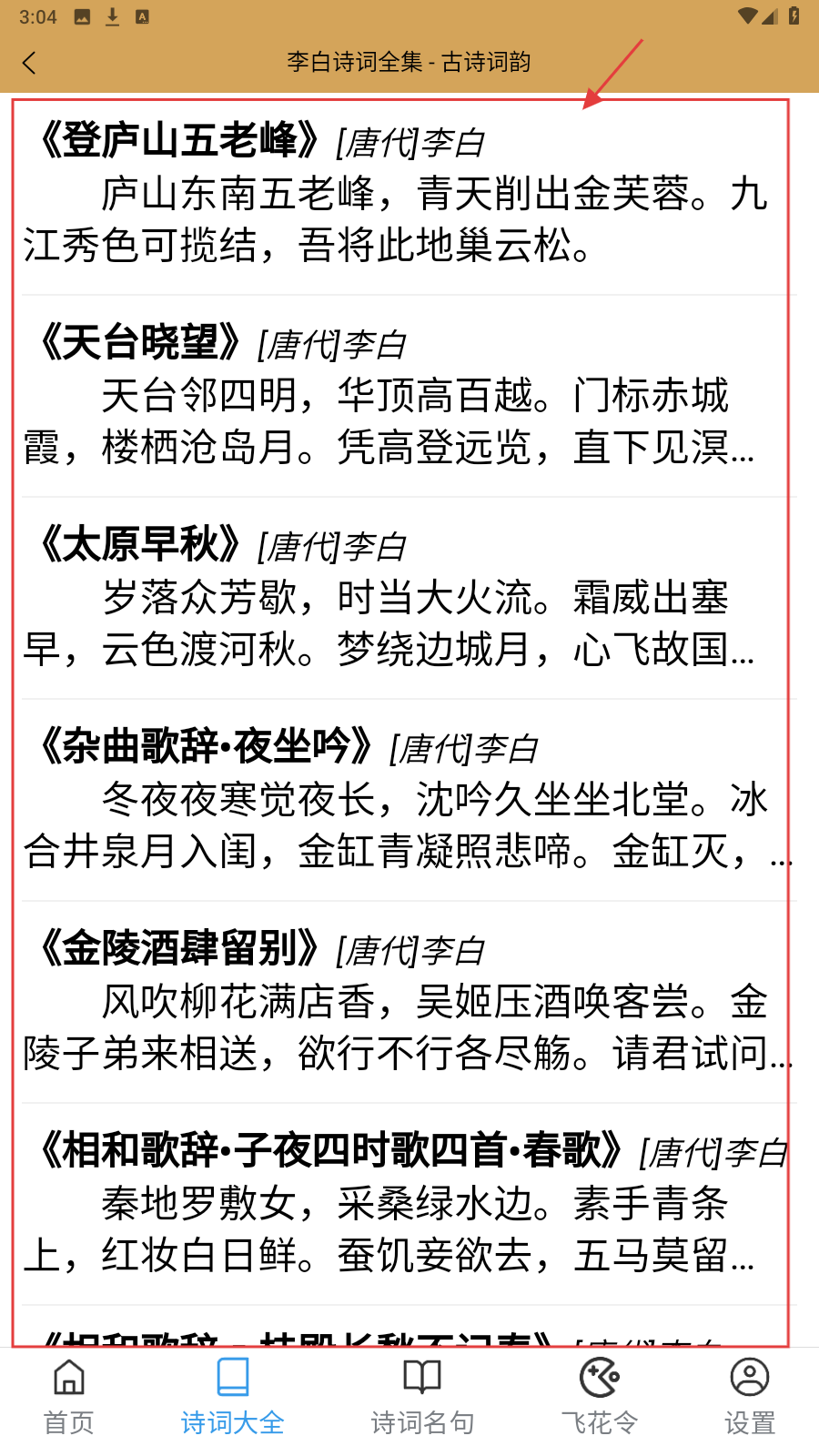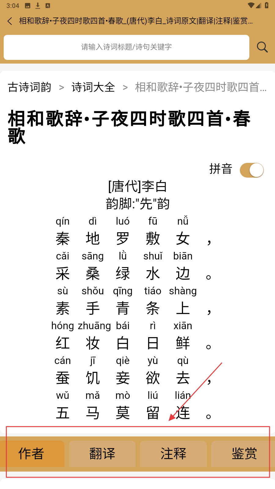 3、进入李白诗词列表,点感兴趣诗词,如《相和歌辞·子夜四时歌四首·春歌》。