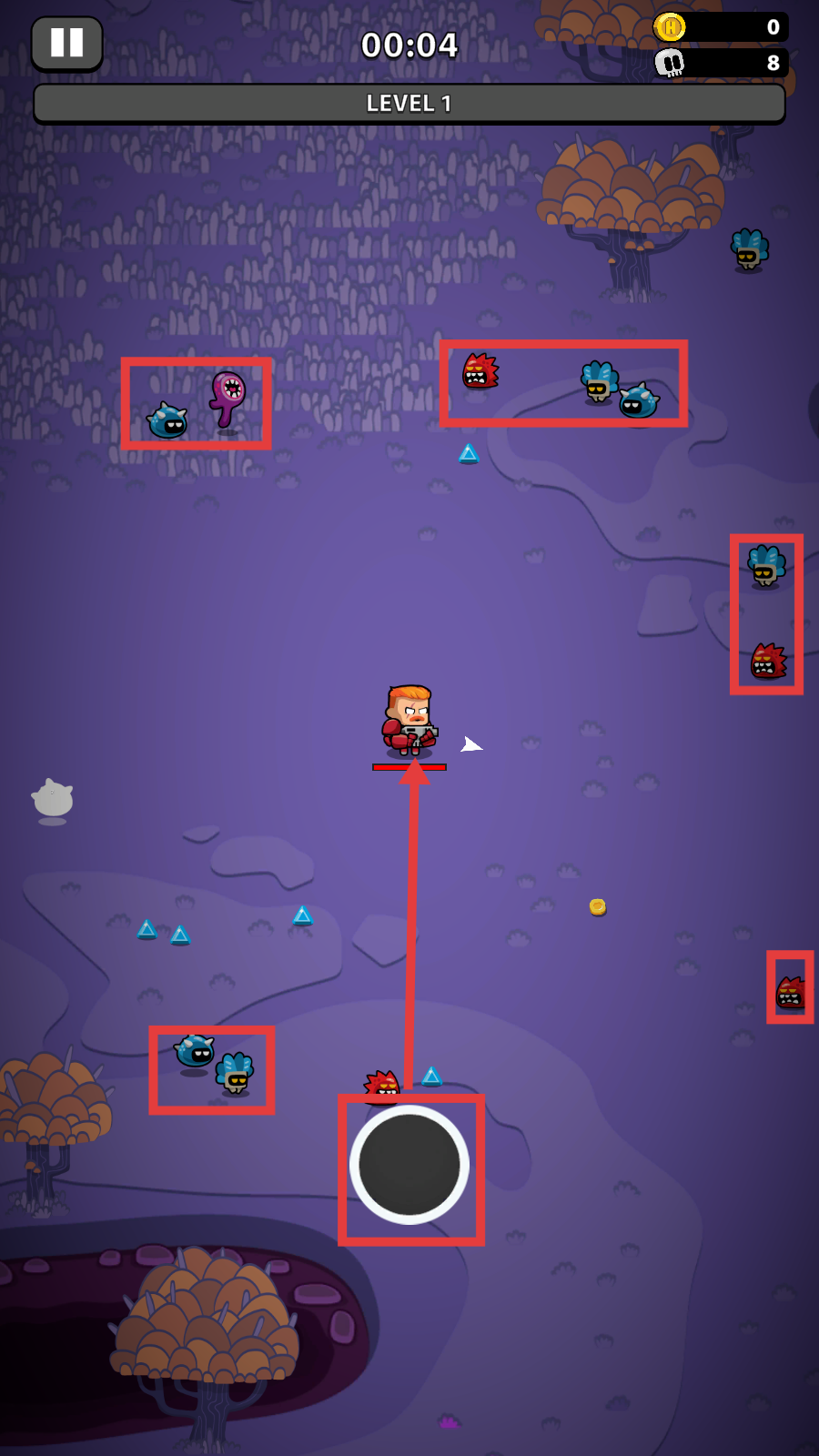 2、Level-1中观察怪物分布,利用中间黑色区域走位,优先清理近身敌人,避免被围攻击。