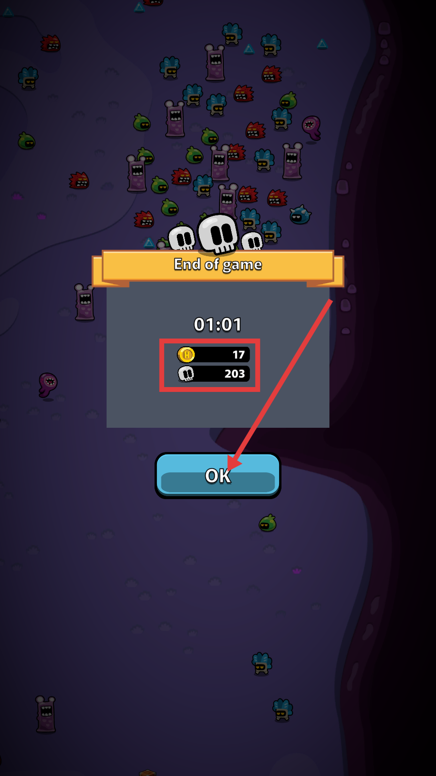 4、挑战结束后,查看【金币-17】与【杀敌-203】数据,点击【OK】确认结算,复盘表现。