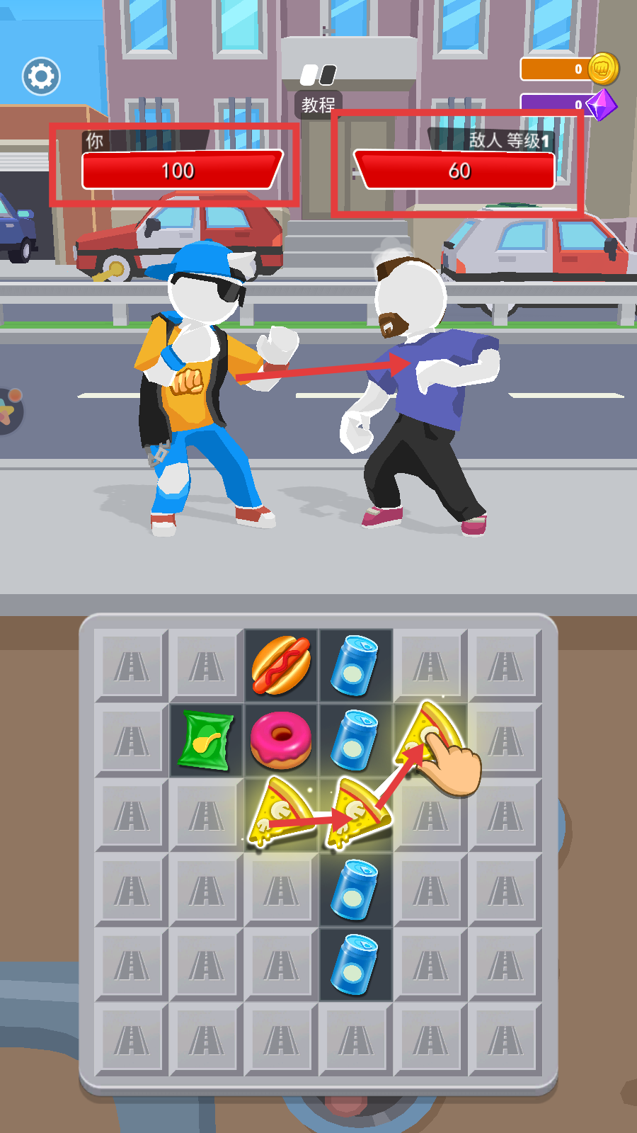 2、战斗时按指引连接【披萨】道具,触发消除机制,借助道具效果对抗【敌人等级1】,提升战斗效率。