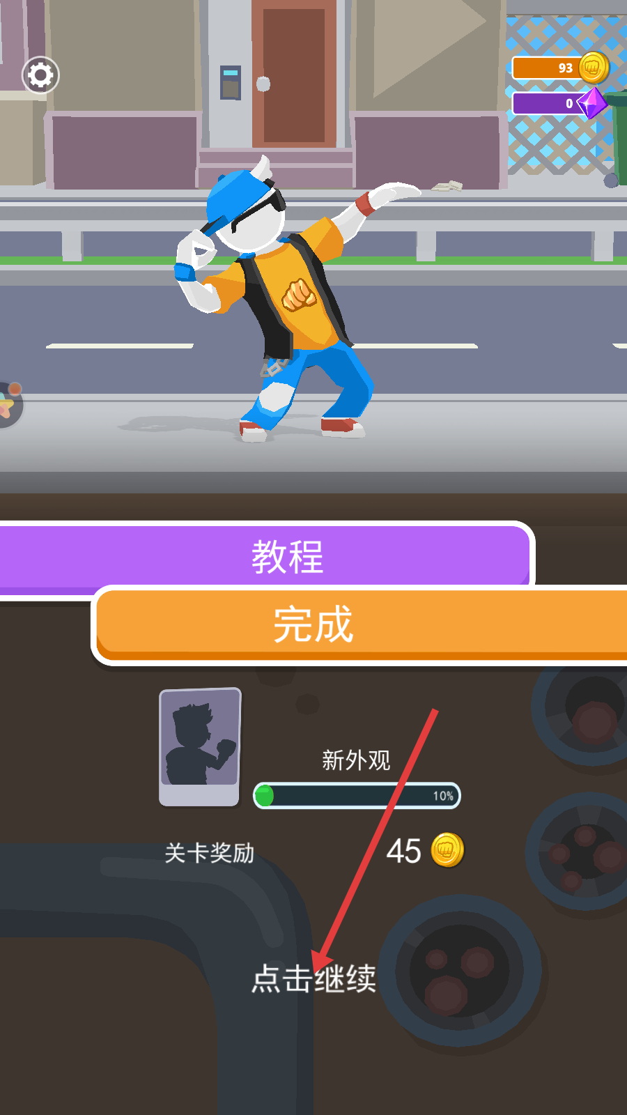 4、教程结束后点击【点击继续】,领取【45-金币】与新外观进度奖励,推进游戏进程开启后续内容。