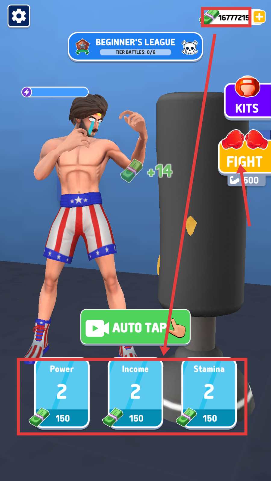 1、主界面消耗金钱(16777215),升级【Power-Income-Stamina】(各150起),强化攻击、收益、耐力,点击【FIGHT】开启战斗。