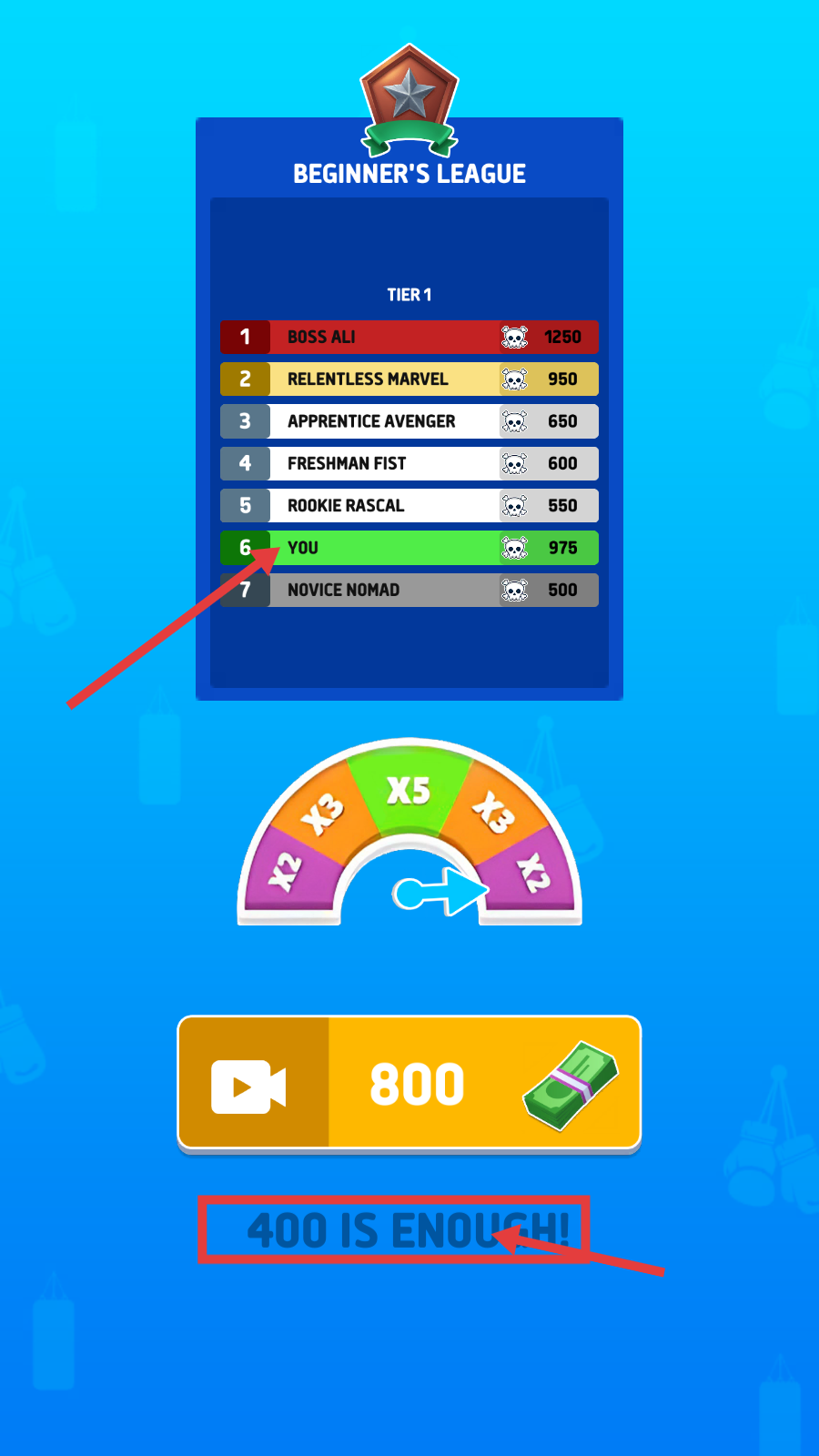 4、胜利后进入【BEGINNER'SLEAGUE】,提升排名(如至第6位),点击【400ISENOUGH!】领取奖励,循环强化。