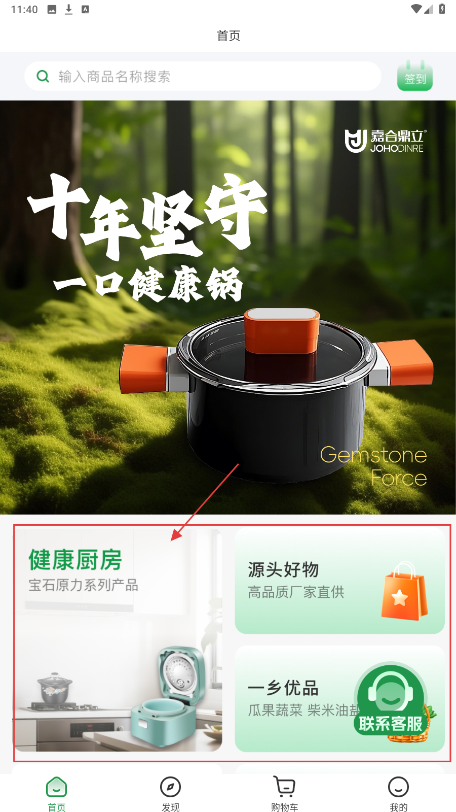 1、进入APP首页,找到【健康厨房-宝石原力系列产品】入口,点击进入分类页面。