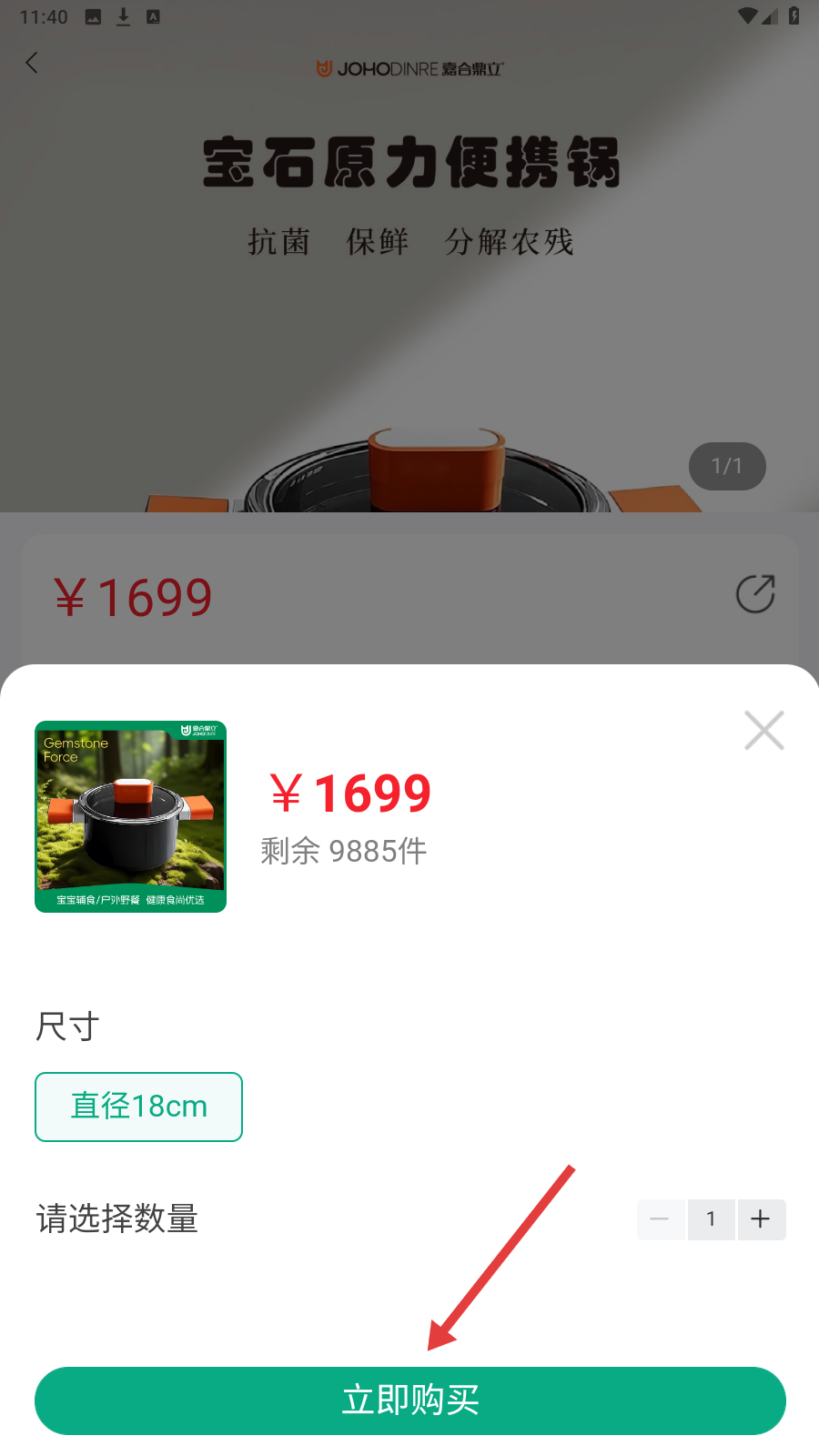 3、在商品详情页,点击【立即购买】,跳转选择商品规格与数量界面。