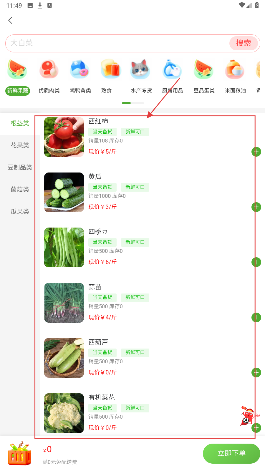 1、进入应用,选【新鲜果蔬】分类,浏览西红柿等蔬菜商品。
