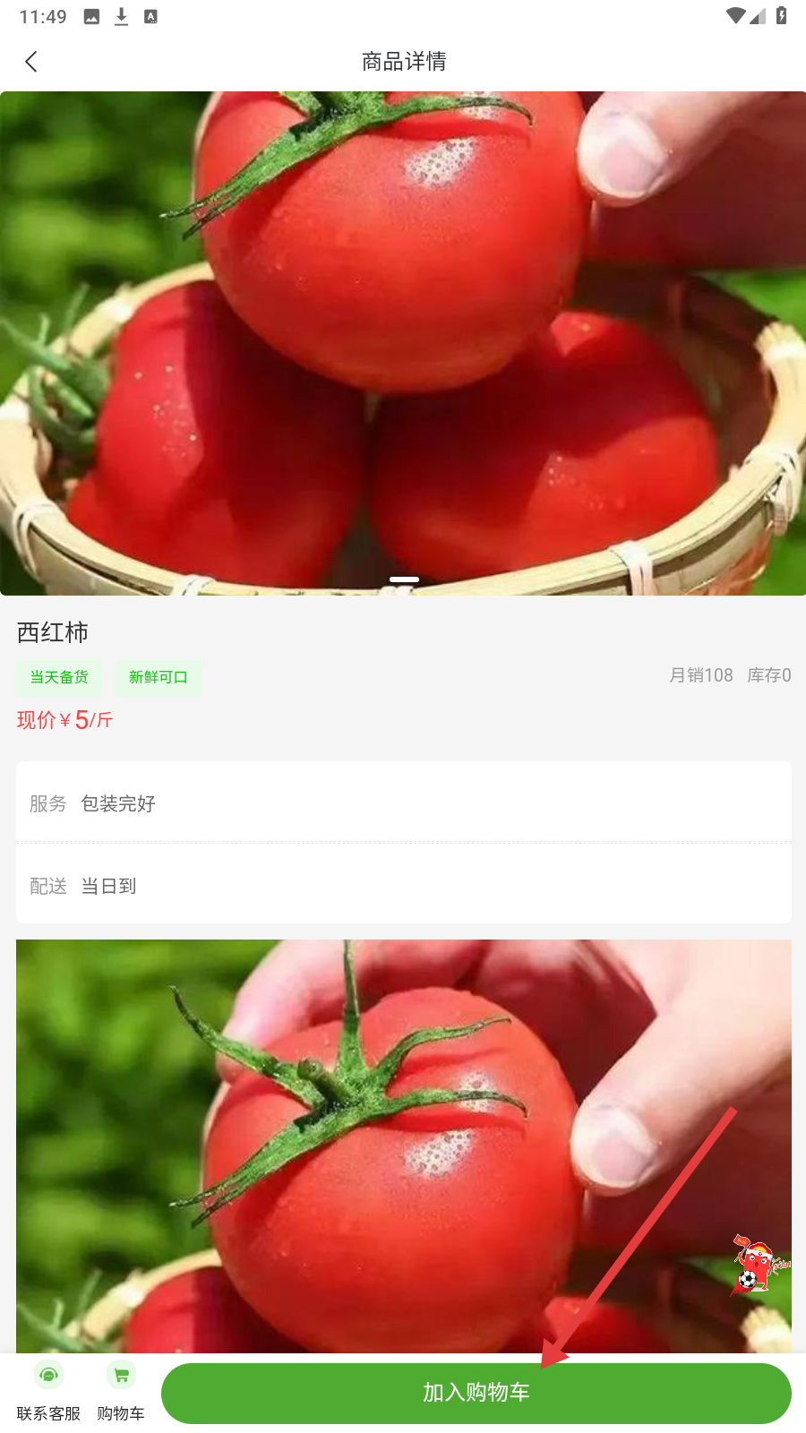 2、点【西红柿】商品,进详情页后点【加入购物车】。