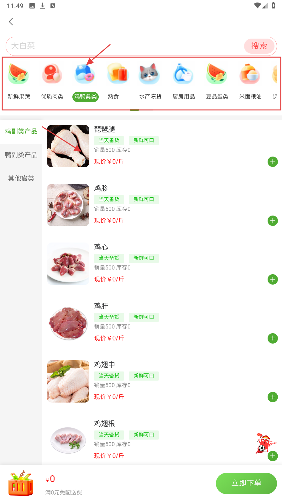 3、切换【鸡鸭禽类】分类,浏览琵琶腿等禽肉商品。