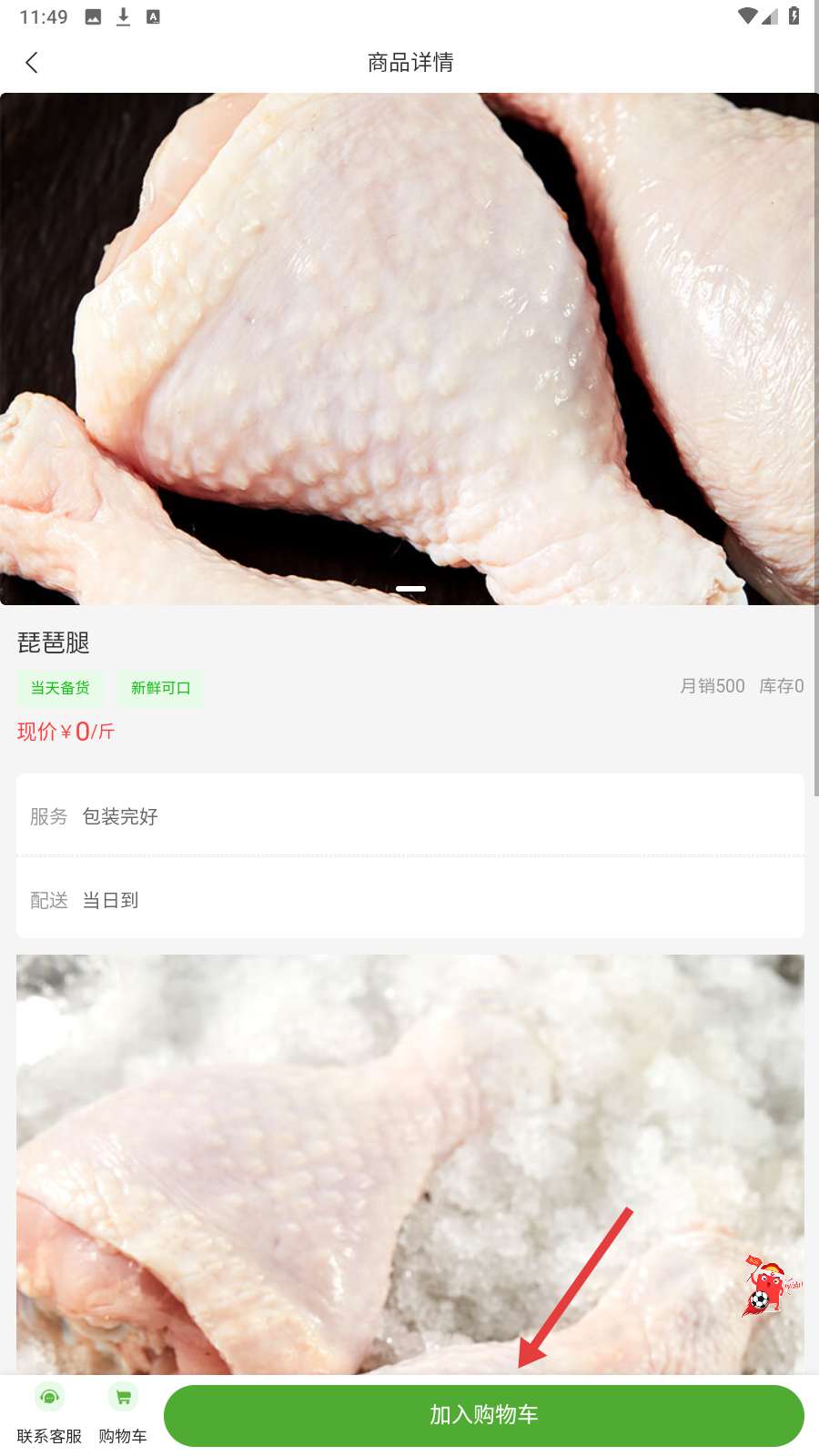 4、点【琵琶腿】商品,进详情页点【加入购物车】,准备结算。