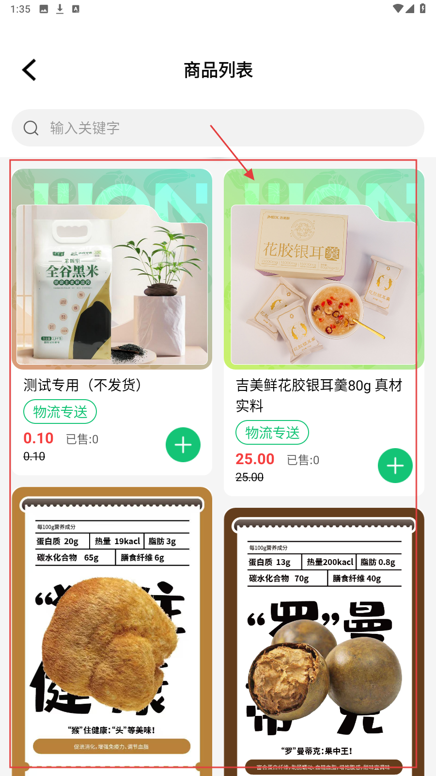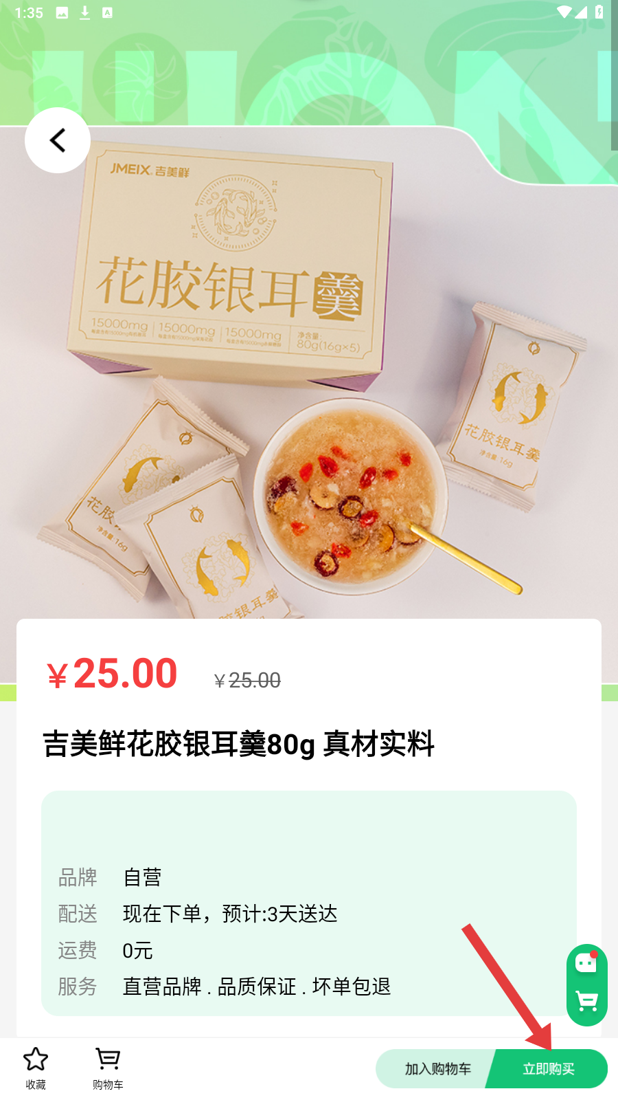 2、在商品列表,找到目标商品如【吉美鲜花胶银耳羹80g】,点击进入详情页。