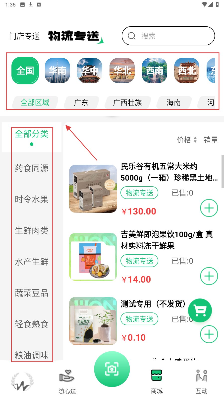 4、还可以切换【商城】页面,选择区域、对应分类,浏览商品列表,挑选商品加入购物。