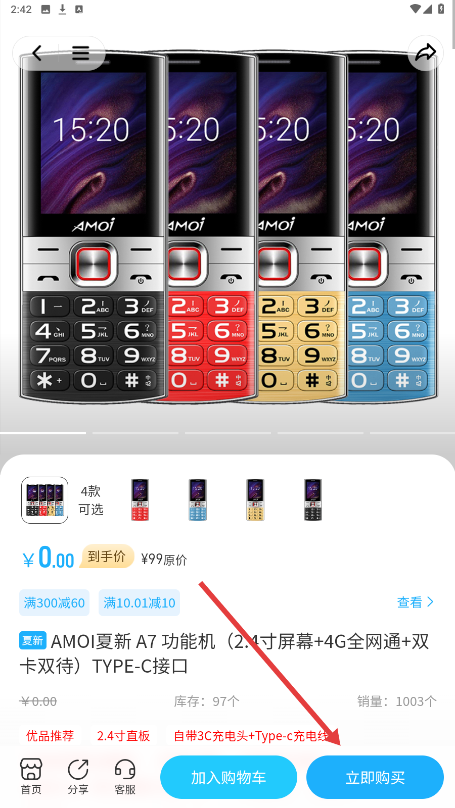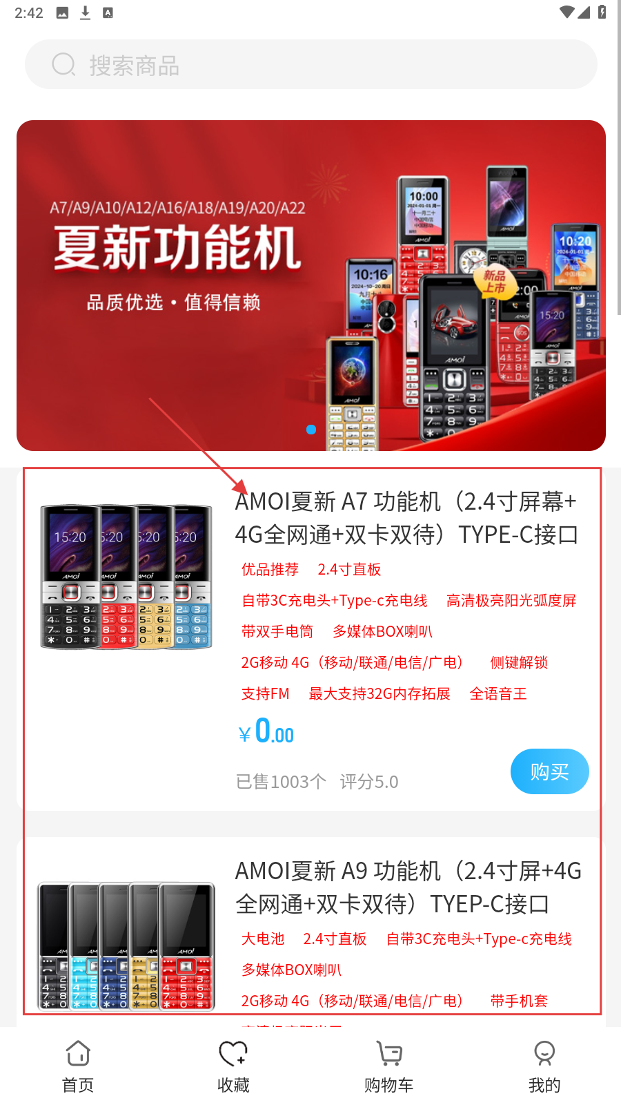 3、浏览商品列表,找到【AMOI夏新A7功能机】,点击进入详情页。