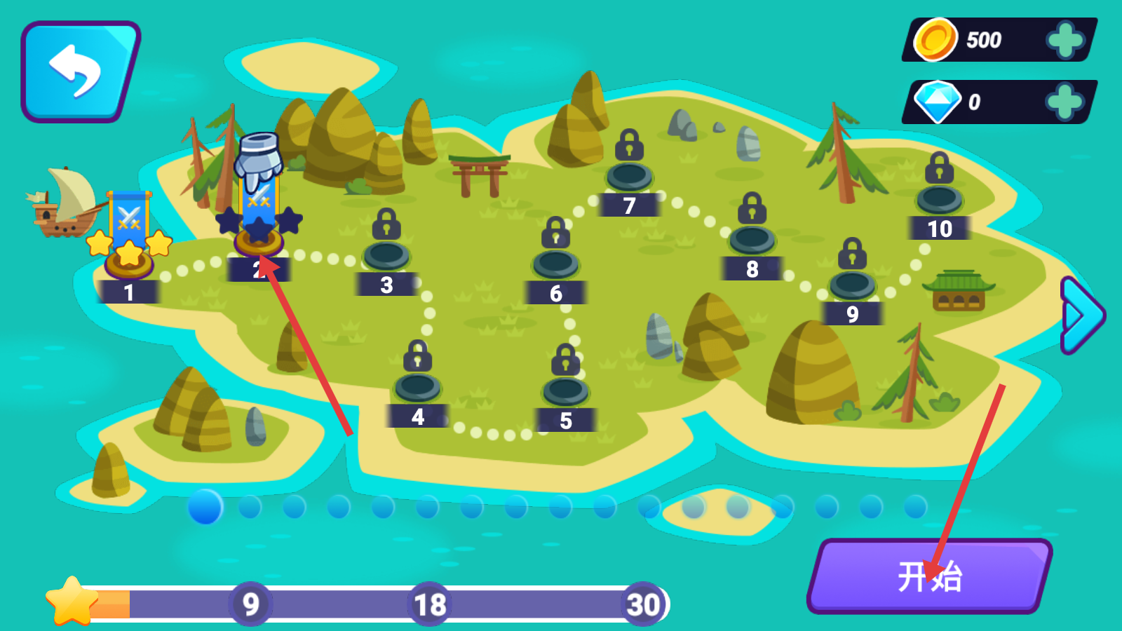 1、地图界面选定【关卡2】,查看【金币-500/钻石-0】,点击右下角【开始】进入战斗。