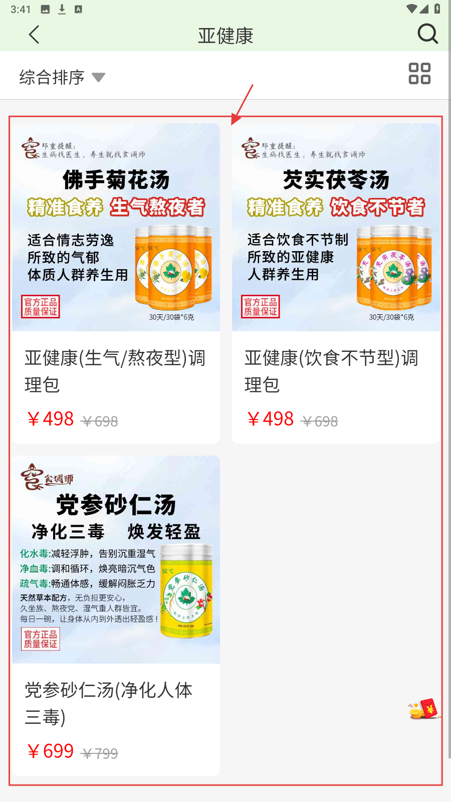 3、进入【亚健康】等分类,浏览调理汤品(如佛手菊花汤等),选心仪产品查看详情。