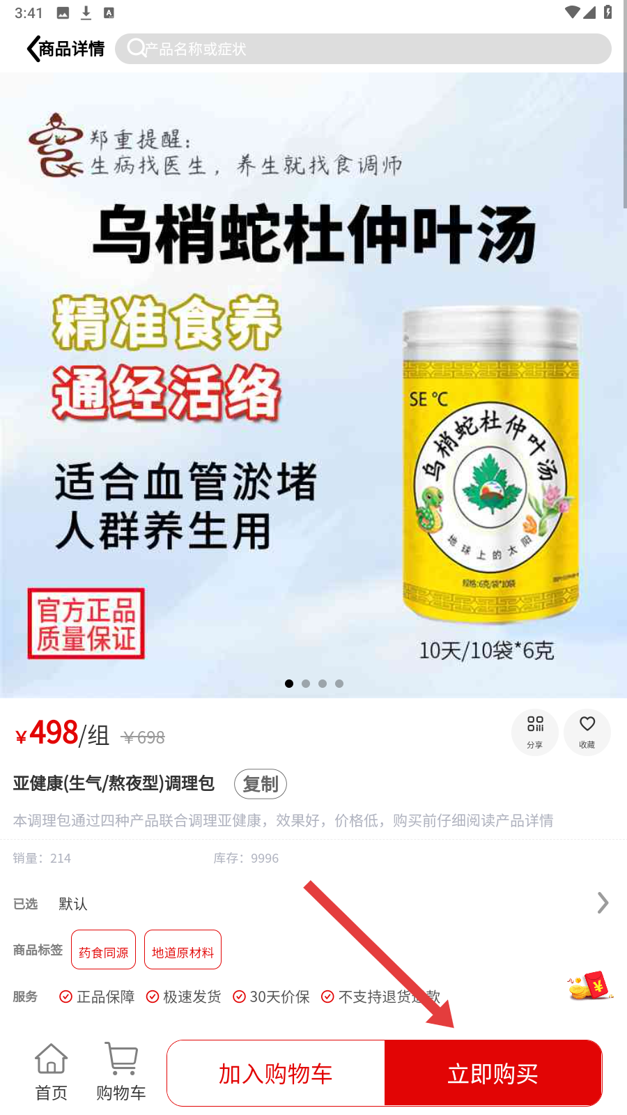 4、确认产品信息(如乌梢蛇杜仲叶汤),点击【立即购买】,完成养生产品下单。