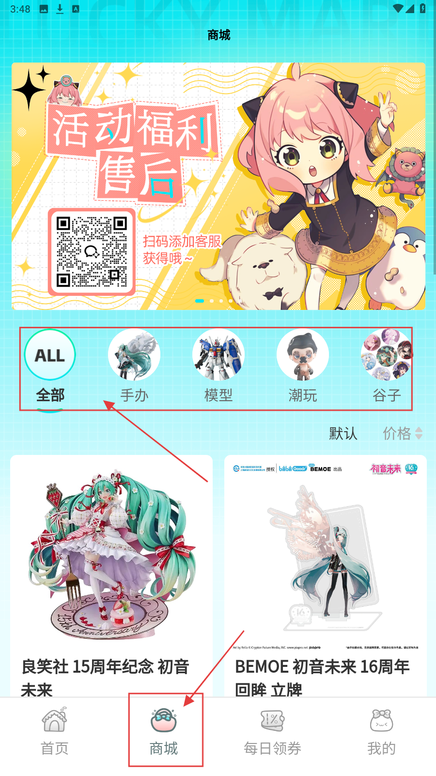 4、进入【商城】页,选分类(如手办、模型),浏览商品列表,挑选心仪商品购买。