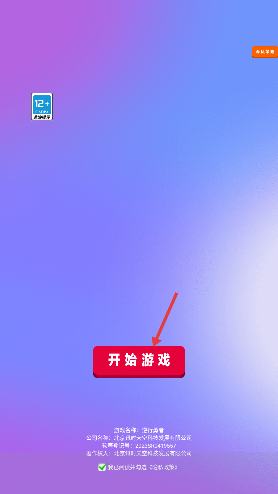 1、开局确认【12+-CADPA适龄提示】,勾选隐私政策,点击【开始游戏】进入《逆行勇者》。