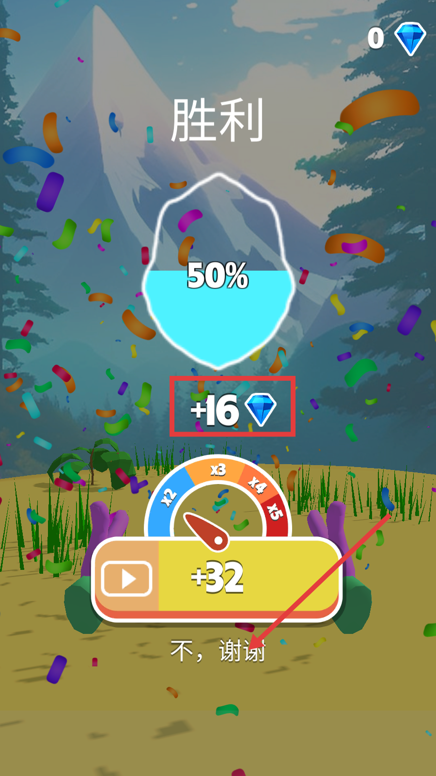 4、胜利领取【+16钻石】,若无需奖励,点击【不,谢谢】跳过广告回归关卡界面。