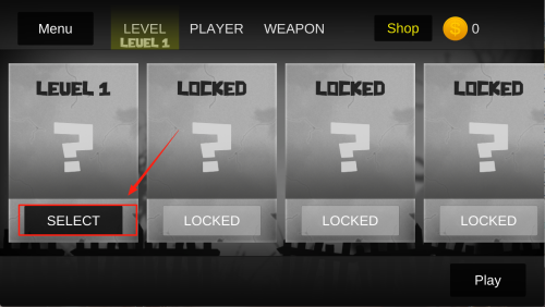 3、选择关卡:进入菜单后,看到“LEVEL 1”“LOCKED”等选项,点击“LEVEL 1”再按“SELECT”解锁第一关。