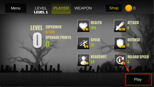 4、开战准备:查看“HEALTH 100 ATTACK 20”等属性,若有“UPGRADE POINTS”可先加点,随后点击“Play”正式开始战斗。