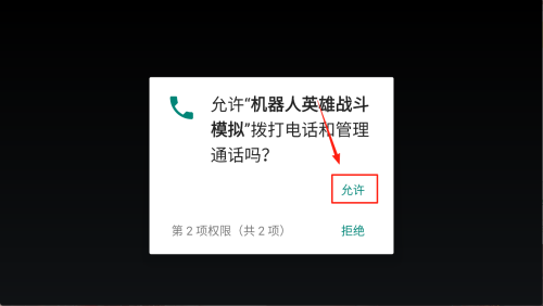 1、授权通话:当屏幕出现“允许‘机器人英雄战斗模拟’拨打电话和管理通话吗?”弹窗时,点击“允许”以授予权限并继续。