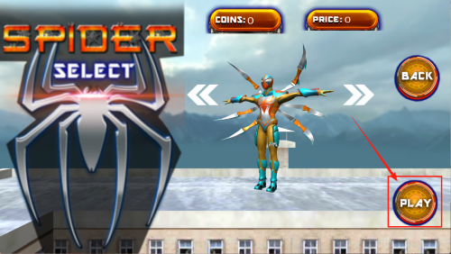 3、确认角色:在“SPIOER SELECT BACK PLAY”界面,点击“SELECT”选定蜘蛛机器人。