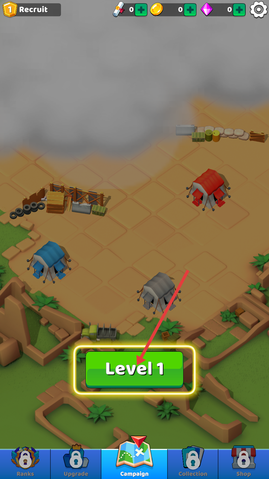 1、进入【Campaign】界面,点击发光的【Level1】按钮,开启新手战役,熟悉基础玩法流程。