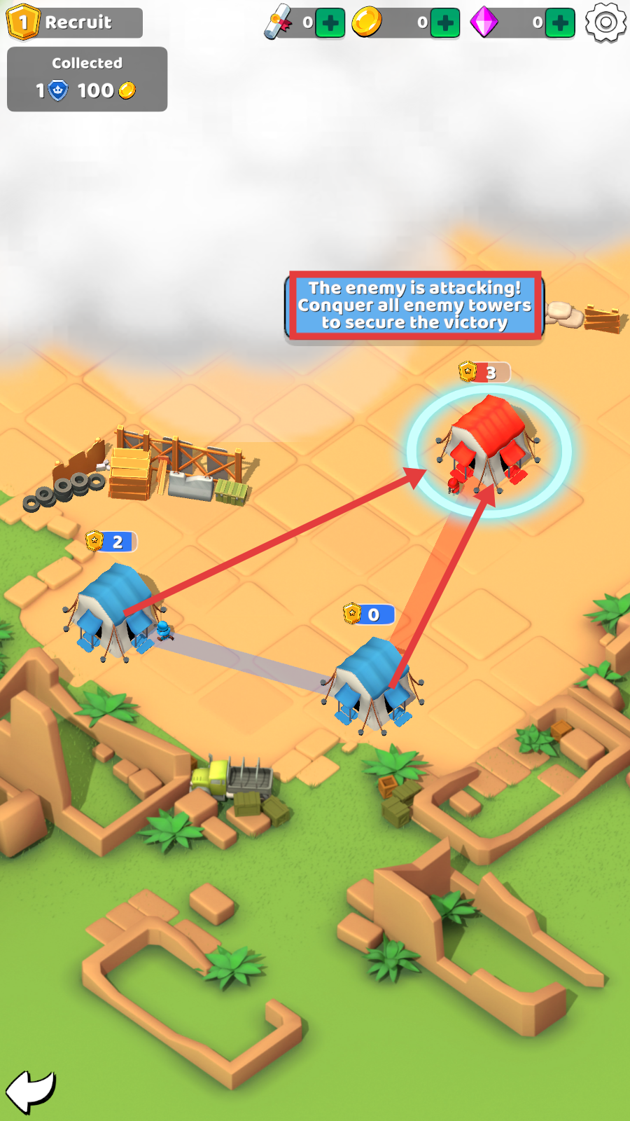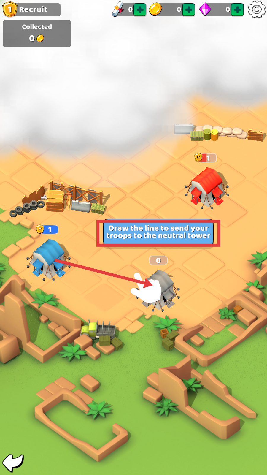 2、根据指引,从己方【蓝色营地】向【中立塔楼】画线路,派遣部队占领,积累初期优势。