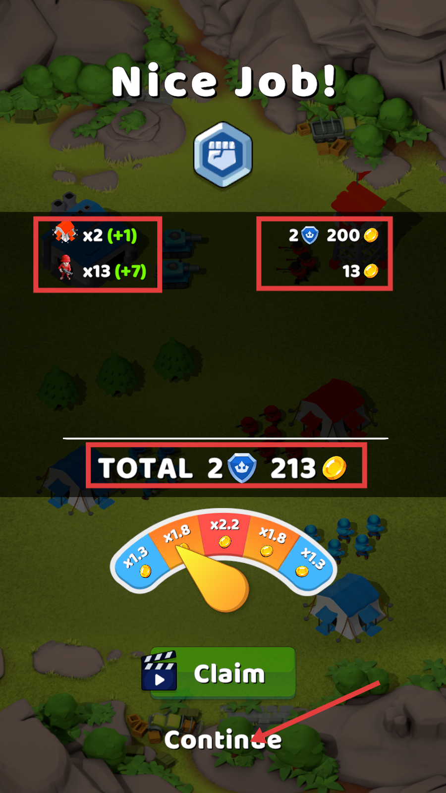 4、战斗结束后,查看【TOTAL-2盾牌-213金币】等奖励,点击【Continue】按钮,推进后续关卡。