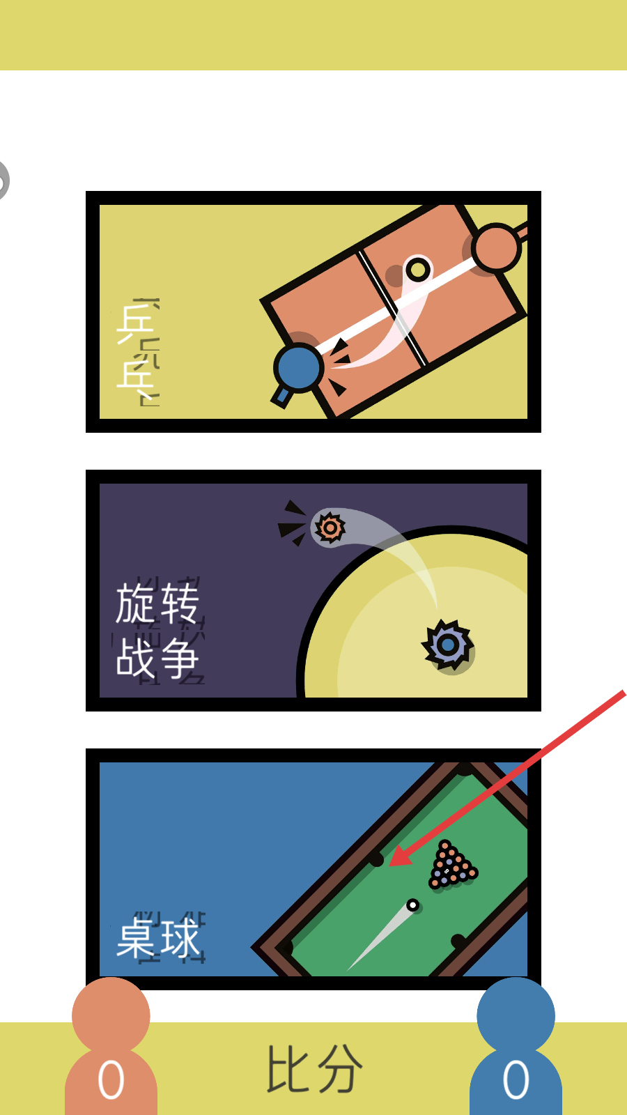 1、游戏选页中,点击【桌球】图标进入玩法,可对比【乒乓】【旋转战争】,优先体验桌球对战。
