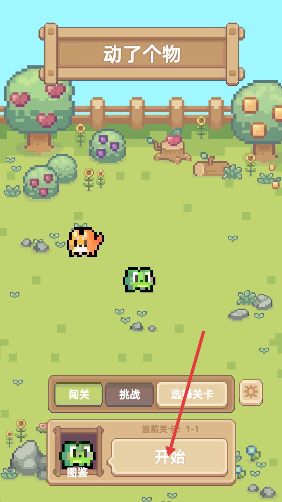 1、进入【动了个物】主界面,点击【开始】按钮,进入【1-1】关卡,开启动物配对挑战。