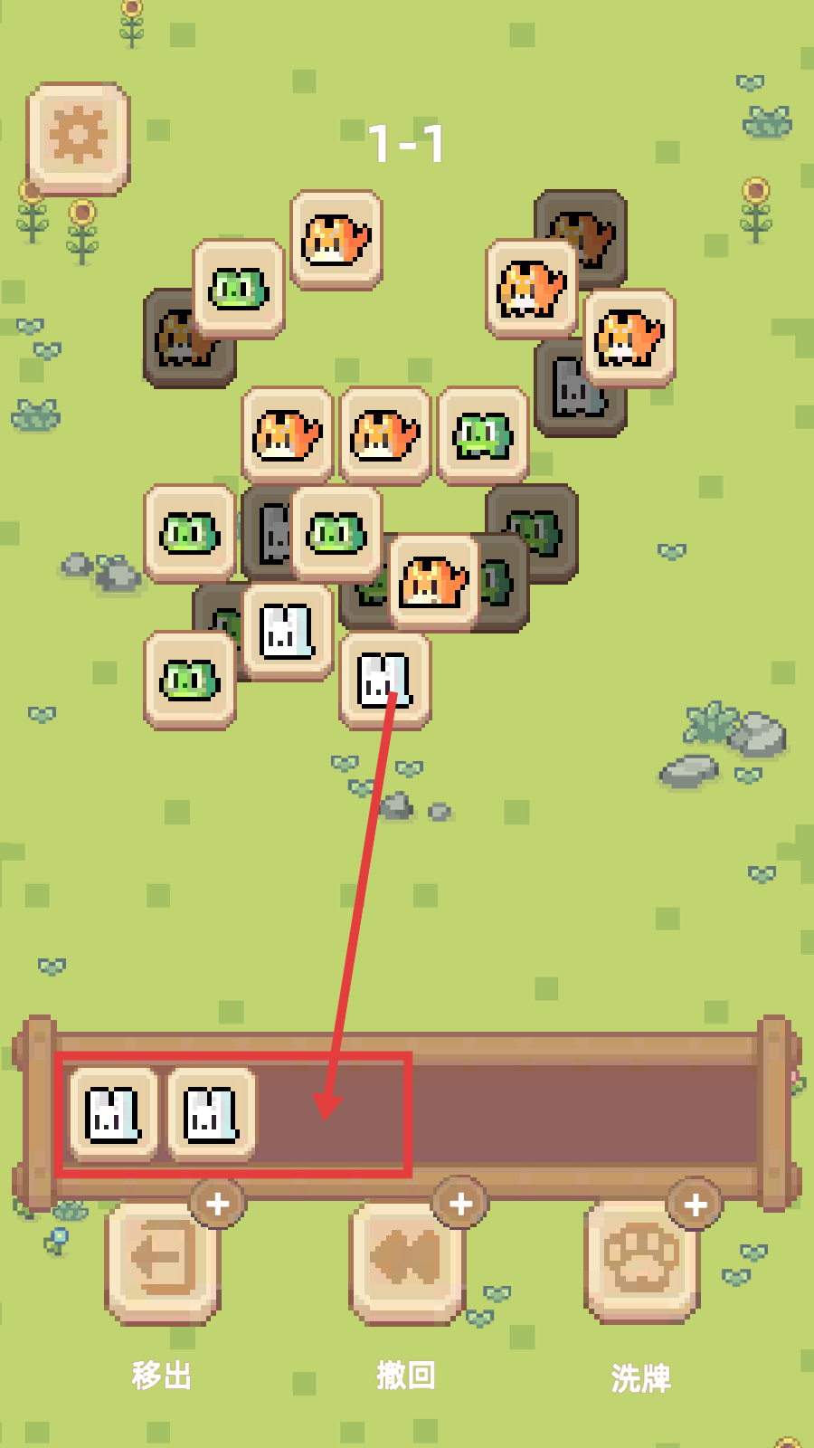 2、在【1-1】关卡,将场上相同的白色动物图标,拖入下方红色框选区域,完成初步整理。