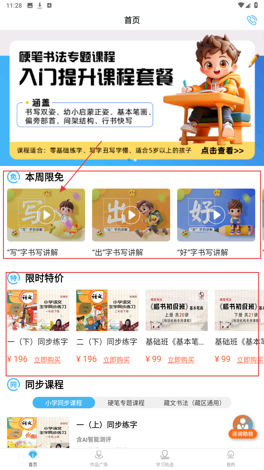1、进入首页,选【本周限免】课程(如“写”字讲解),免费学习书法知识。