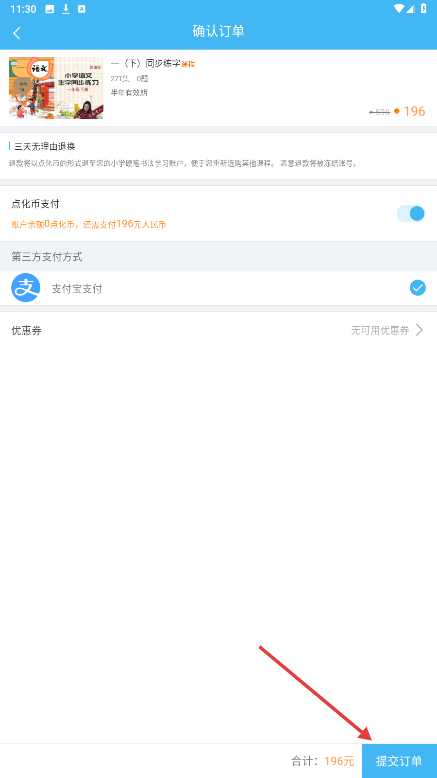 4、确认课程订单信息,选支付方式,点【提交订单】完成购买。
