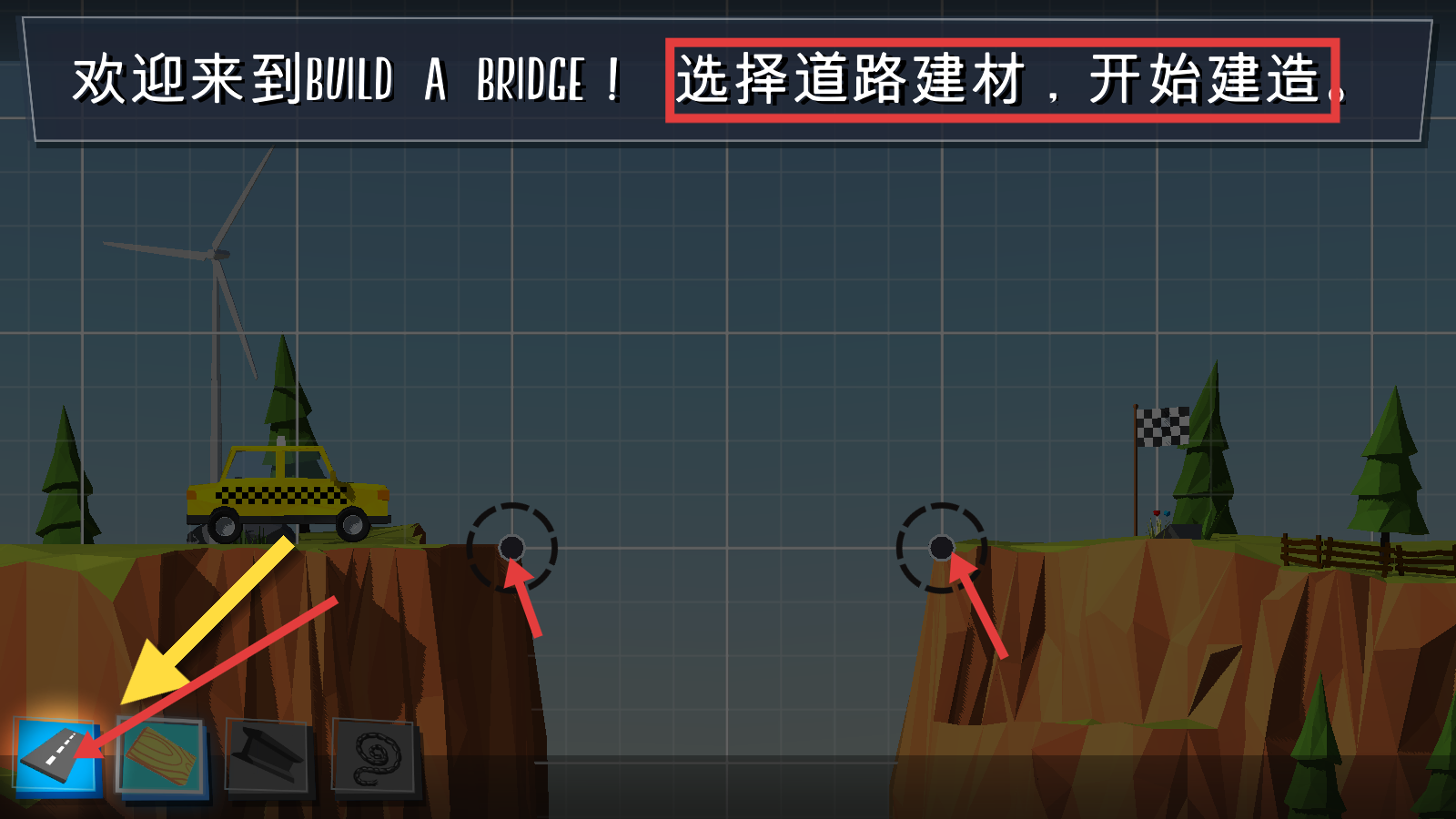 2、进入建造页,按提示选【道路建材】,连接两岸黑点,搭建桥梁基础结构,为通车做准备。