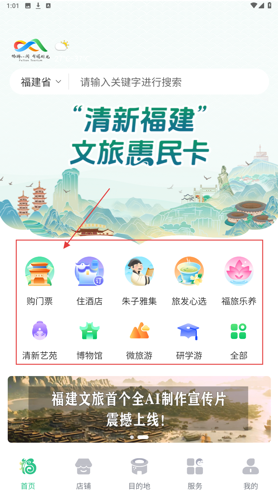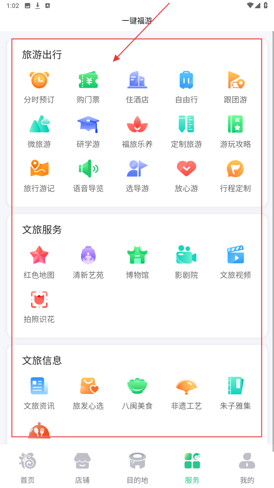 4、切换【服务】页,用分时预订、住酒店等功能,规划福建文旅行程。