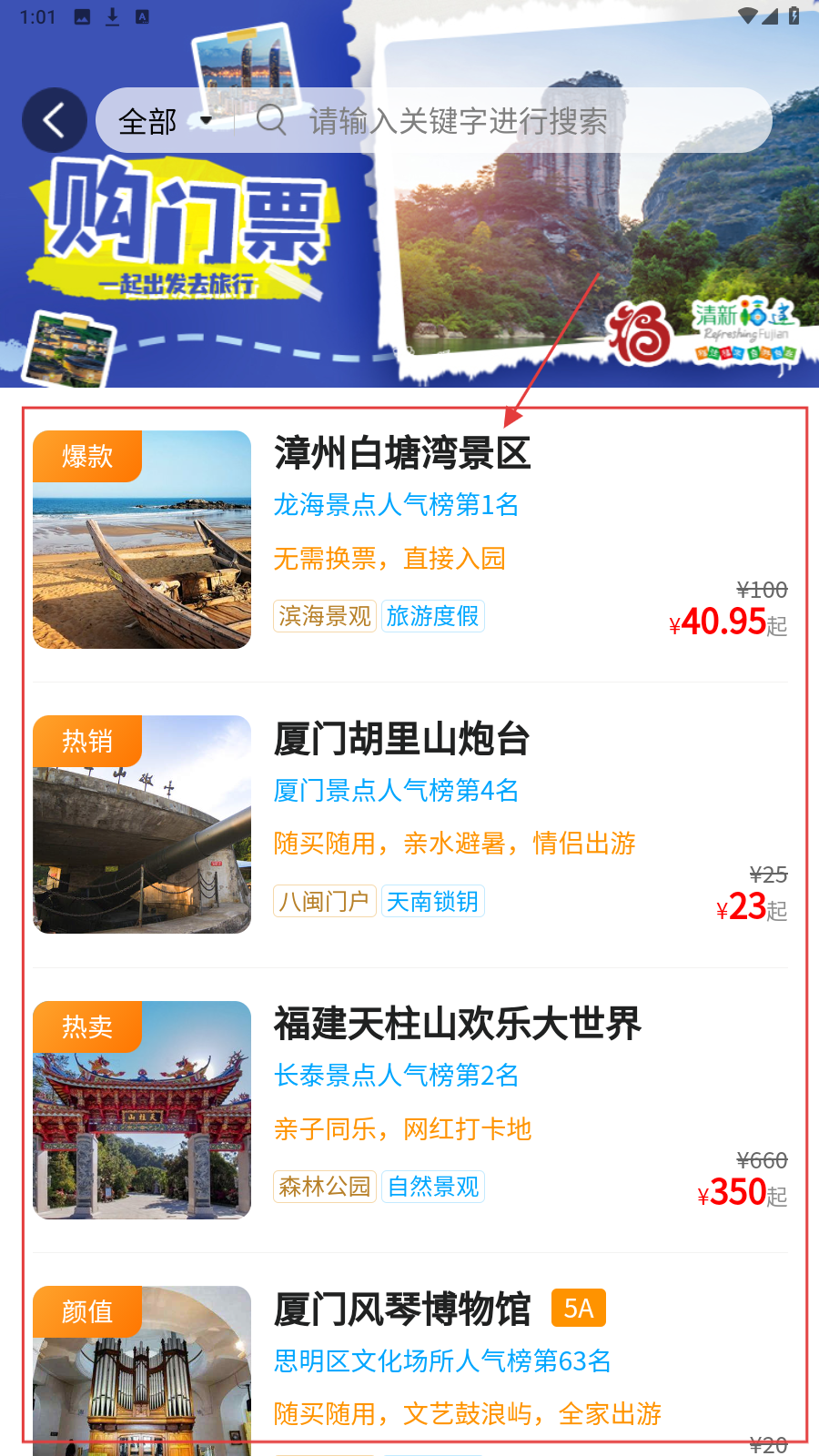 1、进入首页,选【购门票】,浏览漳州白塘湾景区等福建景点。