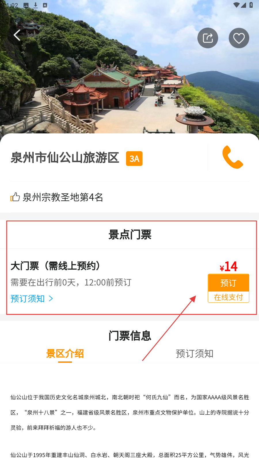 2、点选泉州市仙公山旅游区等景点,查看门票(大门票14元)及预订规则。