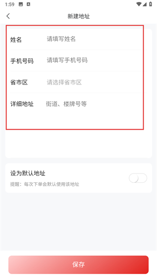 4、填写姓名手机号码等信息,按需设为默认后点击保存按钮。