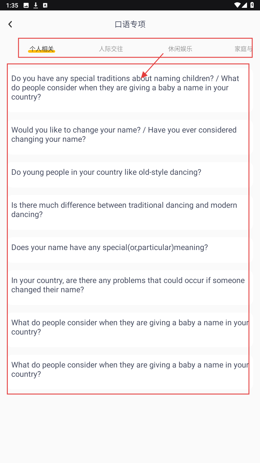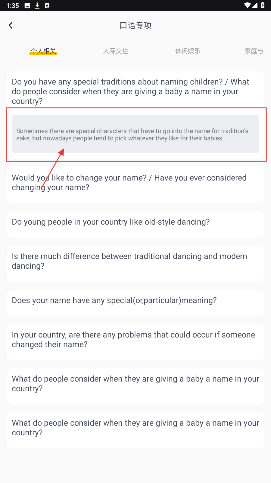 2、在口语专项,选【个人相关】题目(如起名传统),进行口语问答练习。