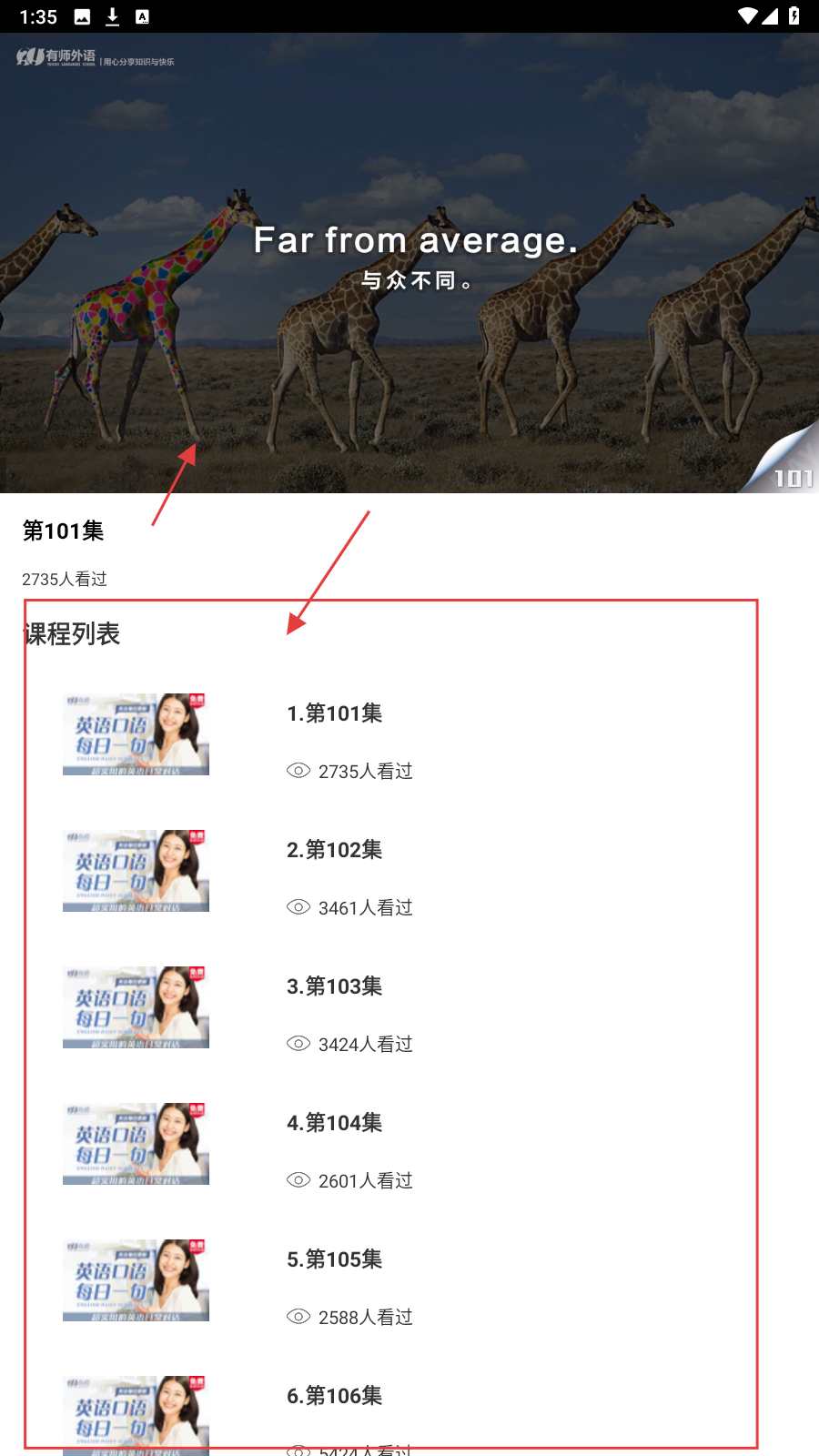 4、切换课程列表,选【英语口语每日一句】集数,进行观看学习,积累口语素材。