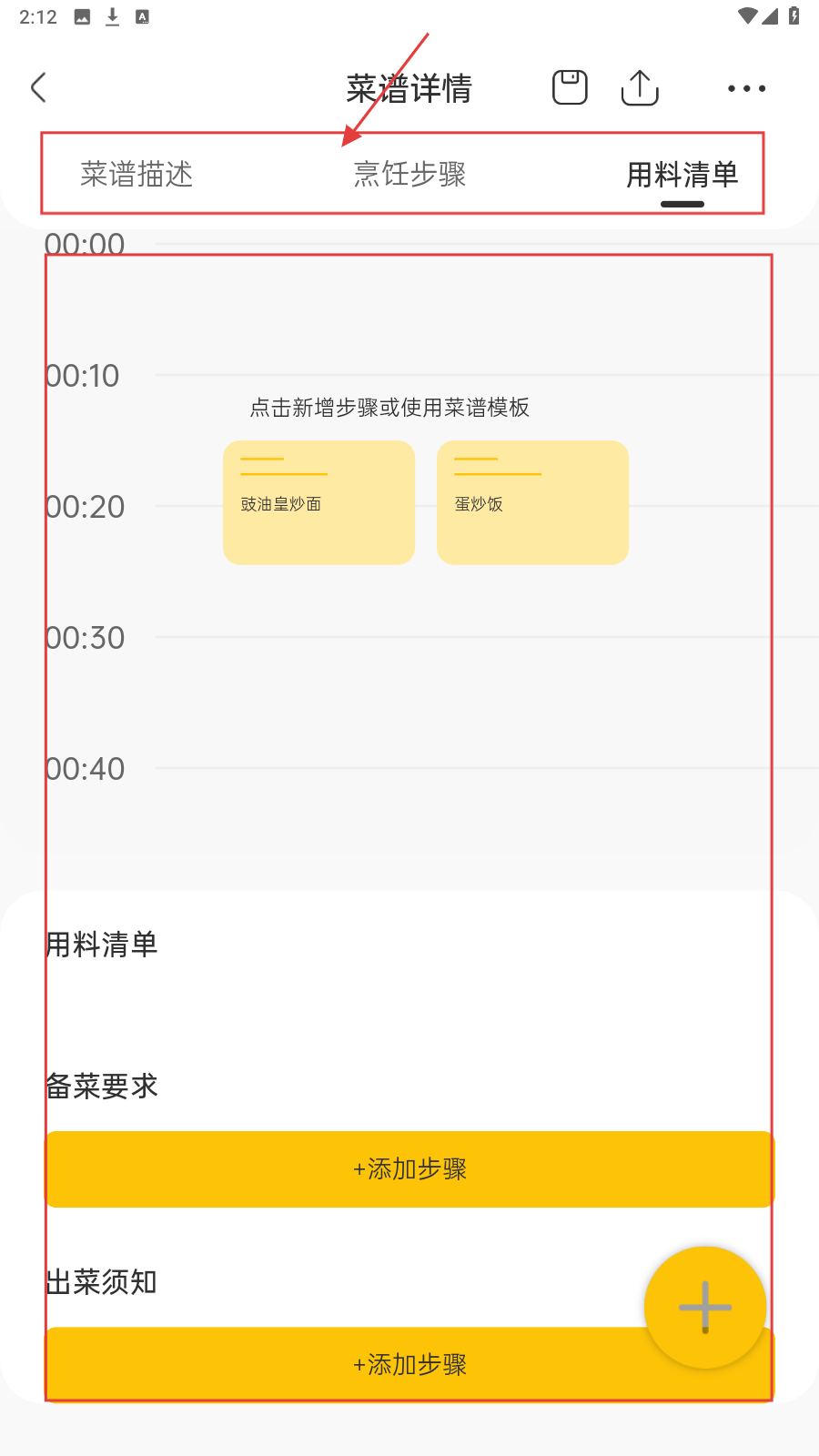 1、进入【个人菜谱】页,点右下角黄色【+】,开始创建新菜谱。