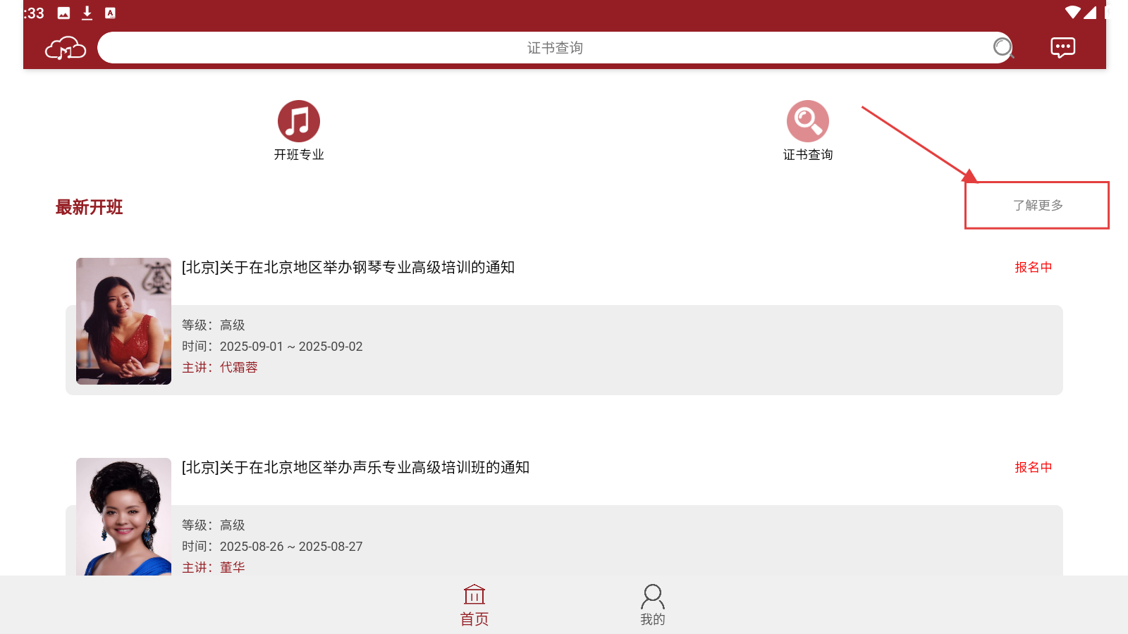 1、进入首页,点【了解更多】,查看最新开班(如钢琴高级培训)。